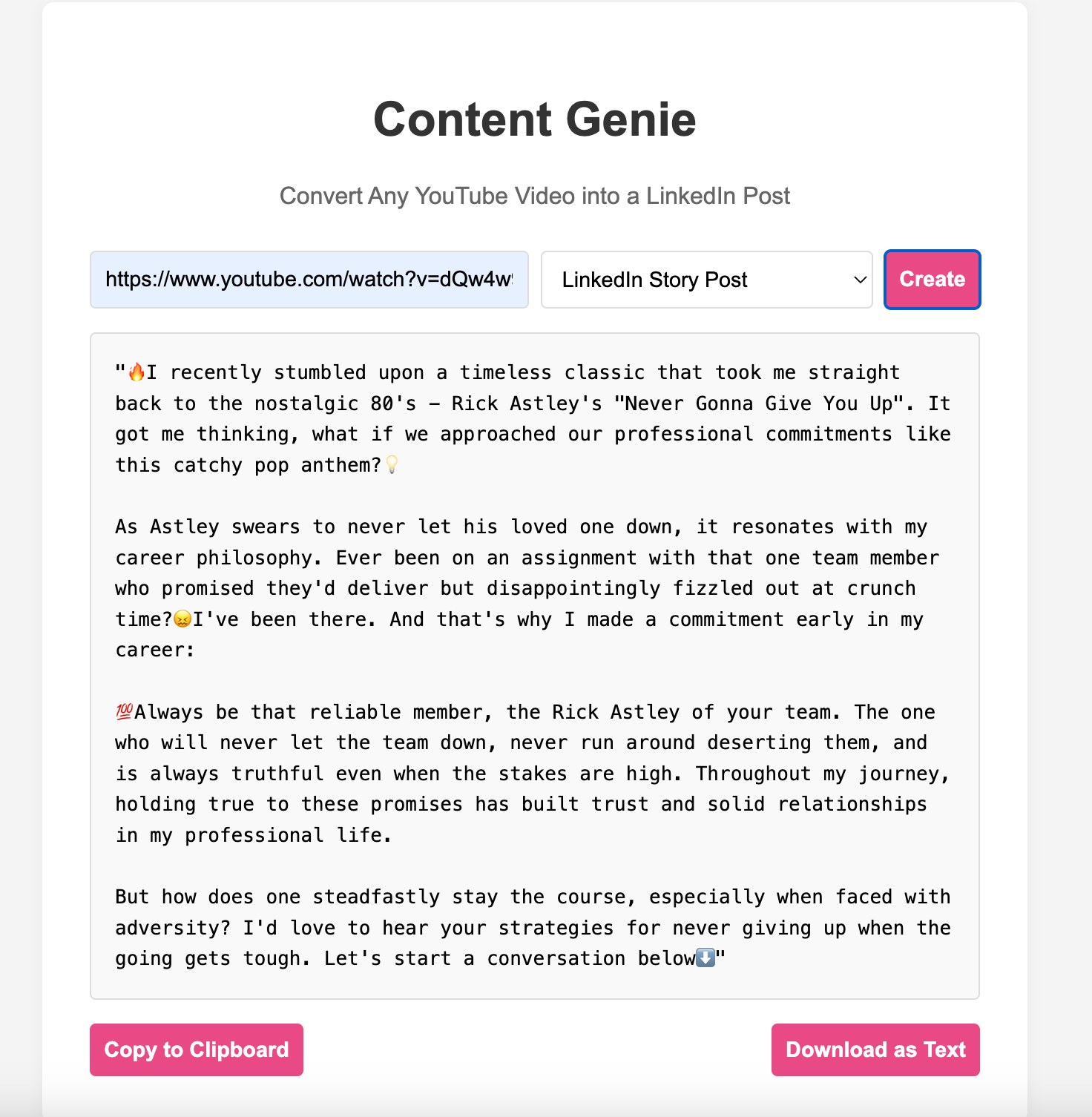 Content Genie is an app that takes a YouTube URL and converts it to a LinkedIn post draft. Paste a TED Talk link, and voilà, you’ve got a ready-to-edit LinkedIn post.